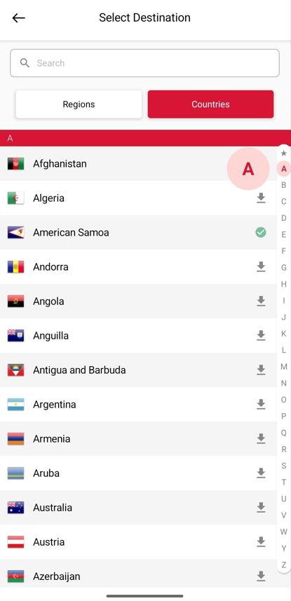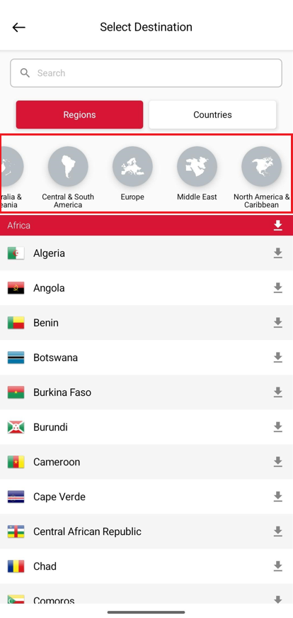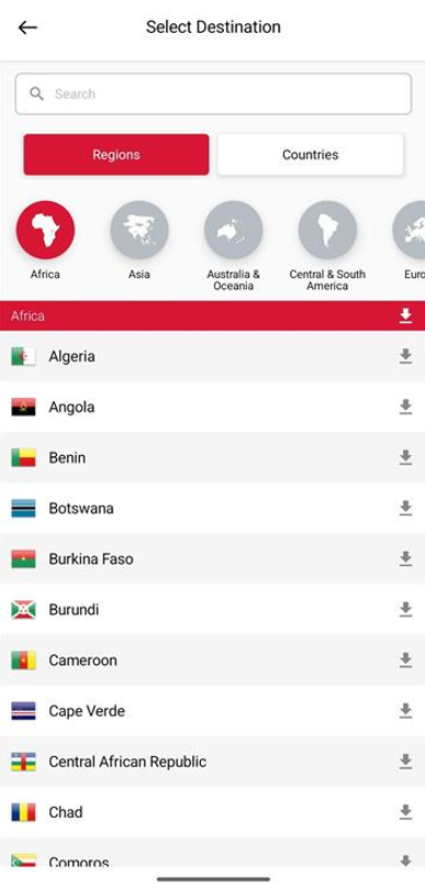 The ‘Regions’ tab is your default view, organizing countries into their respective geographic areas to make your search more intuitive.
