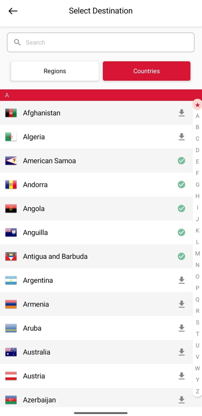 The Quick-Region selector at the top of this tab allows you to navigate through the long list of destinations. Scroll and tap on a region to instantly navigate to that specific section in the list below.