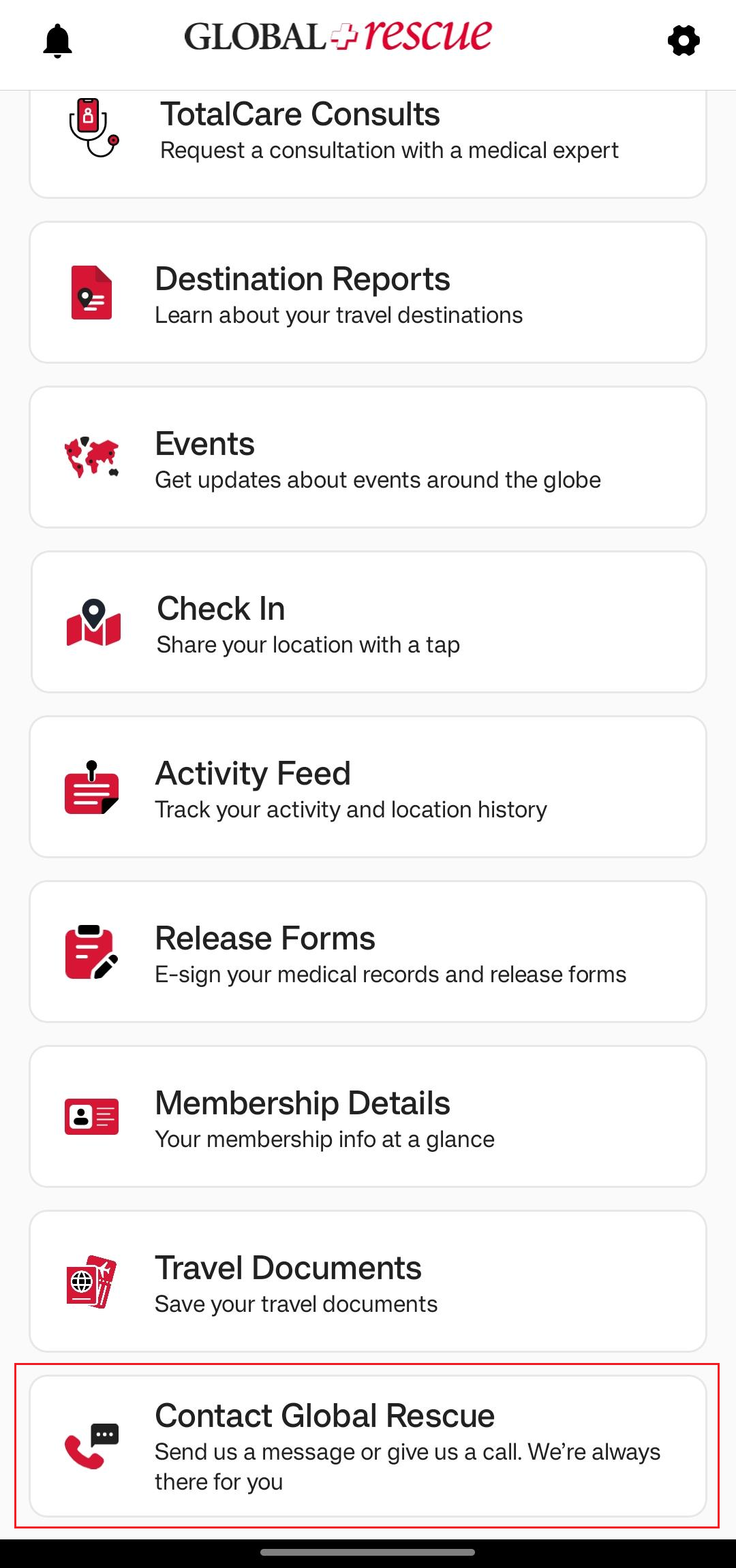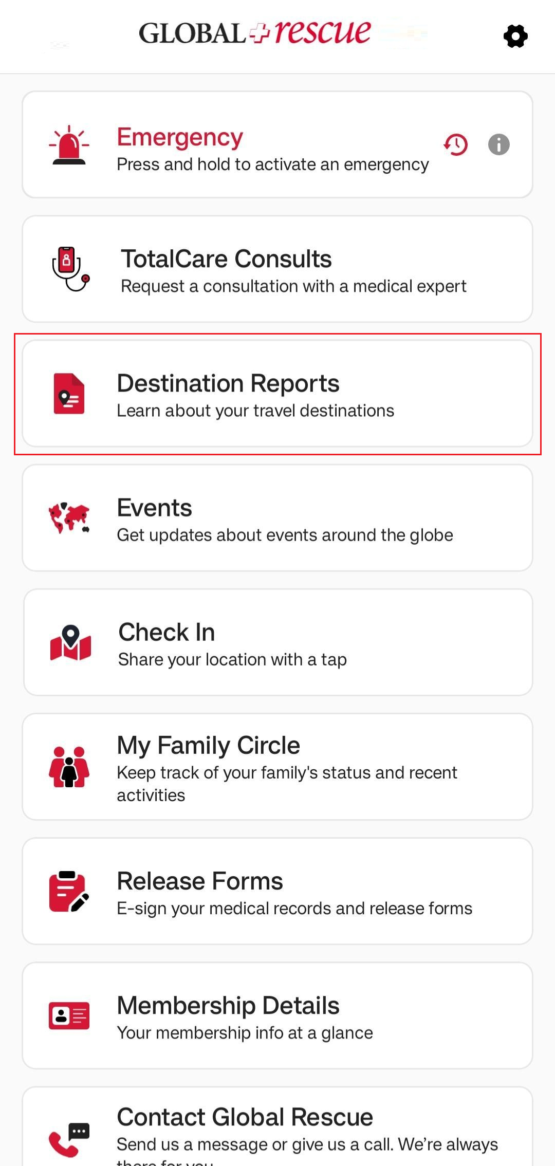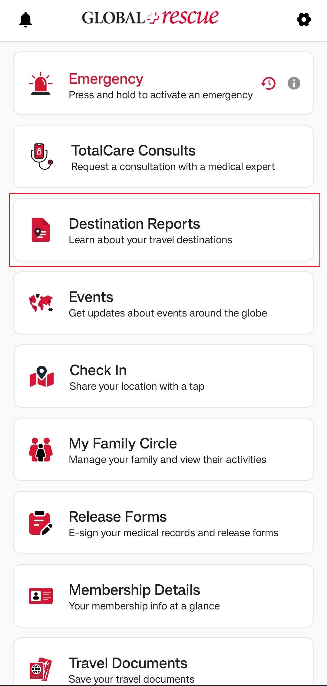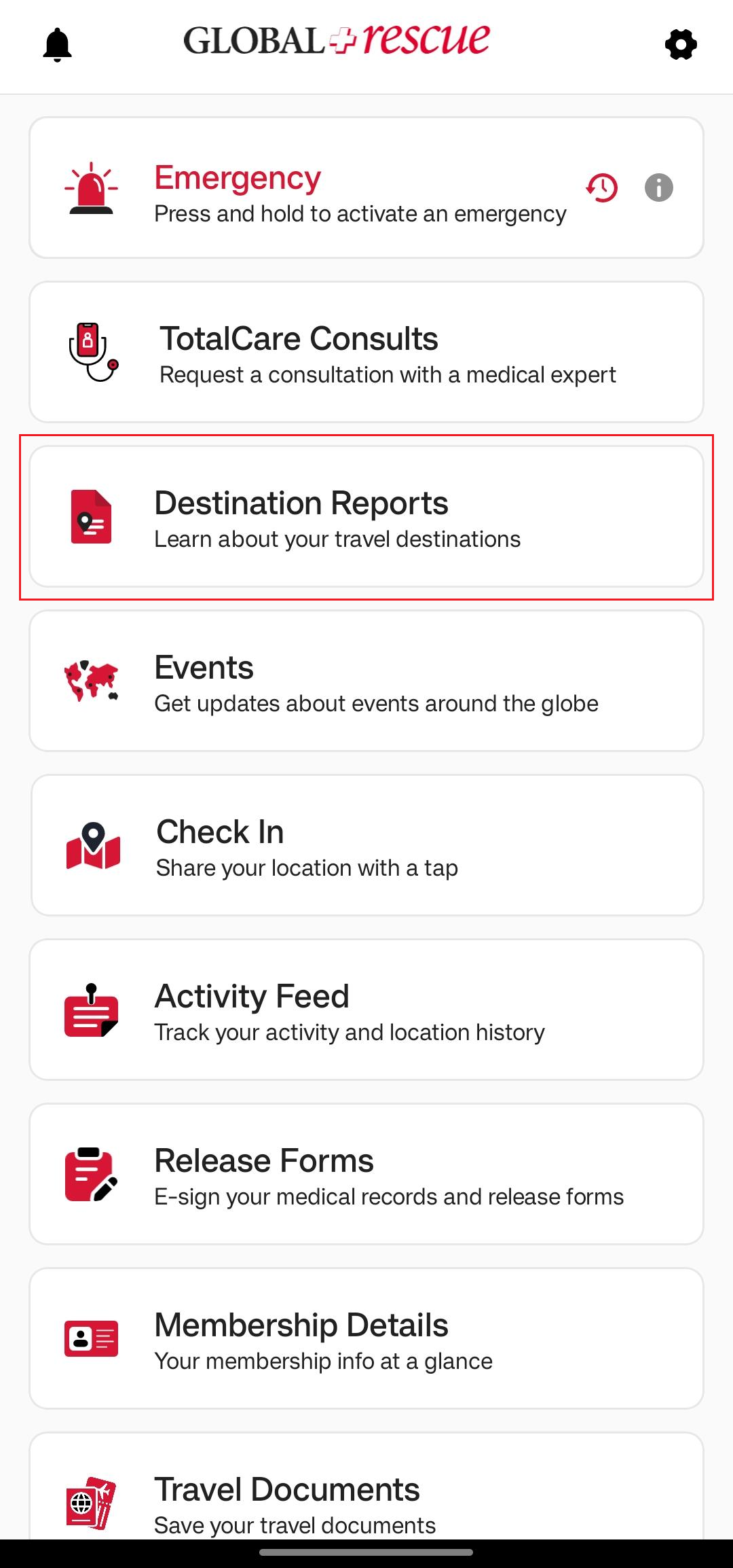 On the Destination Report screen, you’ll find detailed information about the country. The Overall Risk Rating is assigned based on a range of factors, which are explained across the different sections of the report. Each section opens in a new screen for easy viewing. To learn more about the possible risk ratings, tap the question mark next to Overall Risk Rating.